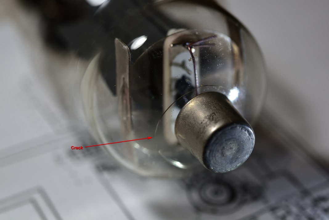 24.) Reinstall the tubes or install new tubes. I purchased new tubes and installed them because, when I took the old ones out, I found one was cracked and they were also mismatched tubes from different suppliers. See the crack in the photo below? Be careful inserting the tubes into the sockets. Rock them very slightly to insert them but, take care they do not slam down into the socket then, put on the tube caps with a slight twisting motion.  Take care not to crack the top of the tube with the cap, as the one pictured below.