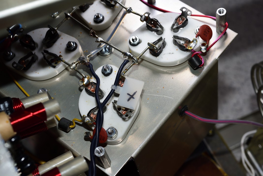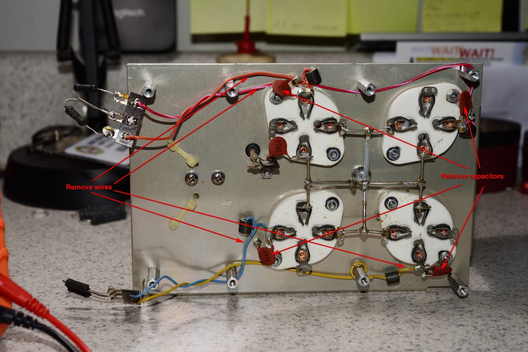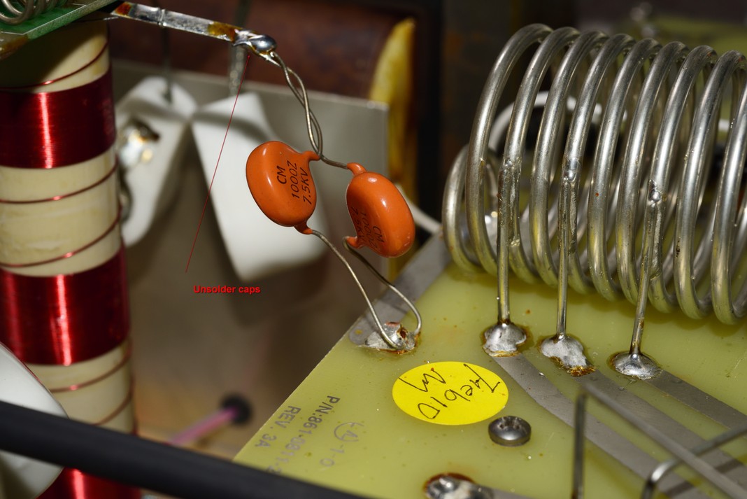 5.) Unsolder the two orange 7.5KV blocking capacitors from the strap coming from under the parasitic PCB that sits in the middle of the tubes and move the capacitors out o the way.