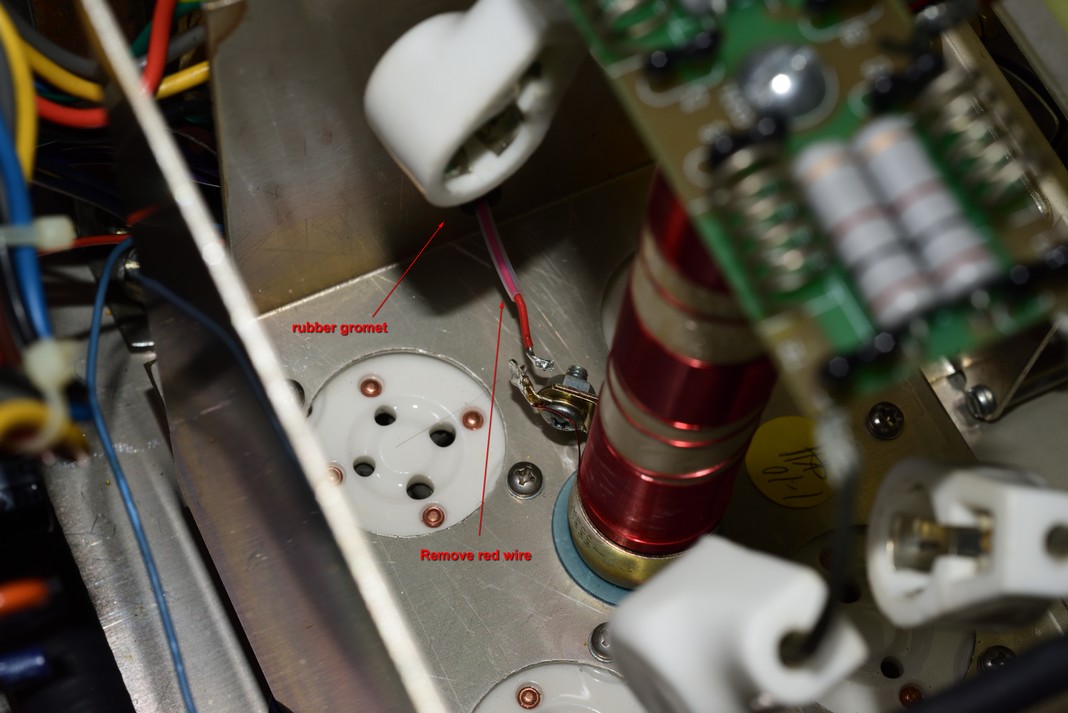 19.) Put the red wire back through the rubber grommet and resolder it to the plate choke.