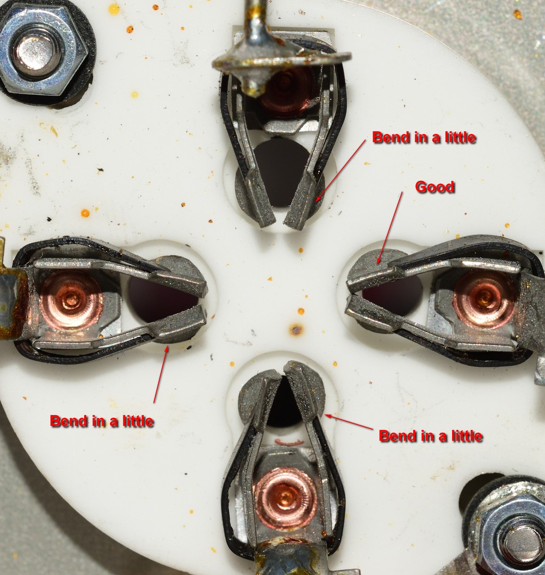 15.) If the tube socket connectors are not straight, you could have a problem getting a tube to insert without the tube suddenly, slamming down into the socket. Check that all socket connectors are straight. When a tube is inserted into the socket; the connectors should hold on to the pins of the tube snugly. You do not want to have any socket connectors that will be loose on a pin. The connectors are spring loaded on the outside of the connector to help put a squeeze on the tube pins. Just check to see that they are straight, together and line up in the center of each post hole.