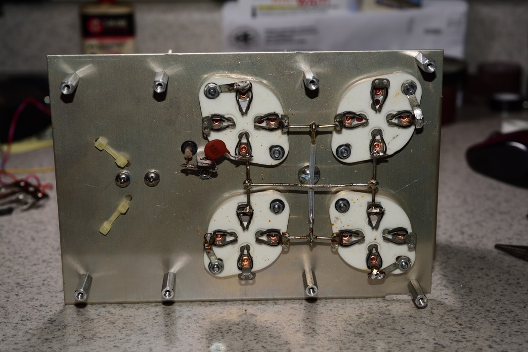 14,) The photo below shows the bottom of the sub-assembly. Next, remove all other wires that were attached to the grid resistors and the bypass capacitors from the grounding straps. Solder all tube grid points (pin #3) to the grounding straps. You will have to loosen the nut and bolt that holds the grounding strap in place to move it. Once the grounding strap is in place retighten the nut and bolt but, DO NOT OVER-TIGHTEN! Over tightening the socket mounting screw can brake the ceramic socket!!!