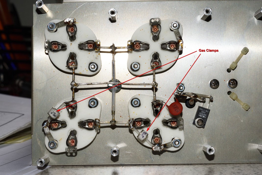 17.) Solder in both gas clamps as shown in the photo below. Now place the plate assembly upright on the bench top and check the clearance. There should be no components touching the bench top except, the plate standoffs.