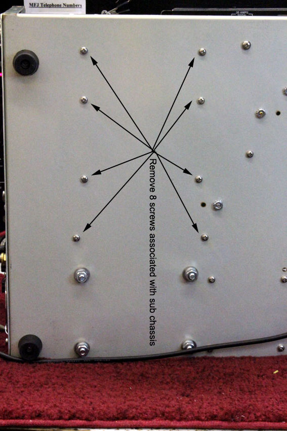 9.) Remove the eight screws that hold the tube sockets and plate. Start at the bottom and work your way up. When you get to the last two screws loosen them while holding on to the sub-assembly. While removing the last two screws, hold on to the sub-assembly to make sure the sub-assembly dose not fall out. You can now lay the amplifier back on to it's rubber feet (right side up).