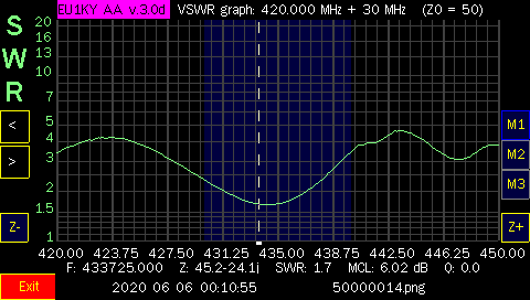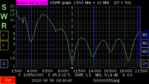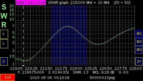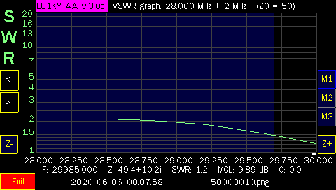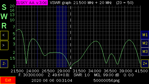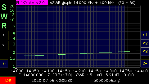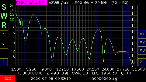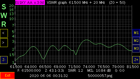 The screen shots below, show what I saw on the Mini600 antenna analyzer that has been calibrated at 50 ohms reference (Z0=50). This is the current setup from the antenna analyzer out to antenna which, is swagged: