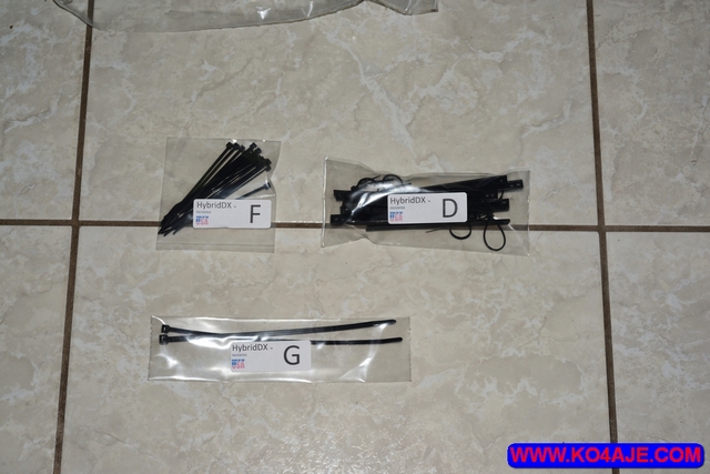 Bag "D" contains the small spreaders. Bag "F" contains the zip ties for all spreaders (D and C). Bag "G" contains the two zip ties to attach the center feedline interface to the support line (A).