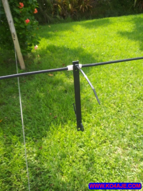 Fifth step - Now comes stringing the wire through the bottom zip ties on all the spreaders. Each wire has clips and string on the end of the wire that hangs down, the other end is what you string through the spreaders. The clips, are used to swag the ends up toward the center of the antenna, toward the center interface assembly. Before I tried to string the wire through the spreaders, I loosened each nut on the center interface assembly and attached the wire there, to hold on to it while, unwinding the wire out toward each end. I used an unrolling motion, to lay out the wire to eleminate curls in the wire and avoid getting kinks. Attaching the end of the wire to the nut, helped keep the wire from rolling back toward me. Once the wire was rolled out, I unattached the wire from the center interface assembly, went to the end with it and started running it through the bottom zip ties on all the spreaders, watching that no kinks develope while pulling it through each zip tie and reattached the wire to the center interface which, is the sixth step of the instructions. I then worked my way back to the end straightning the wire as I went and tightening each bottom spreader zip ties, this was in the eighth step.