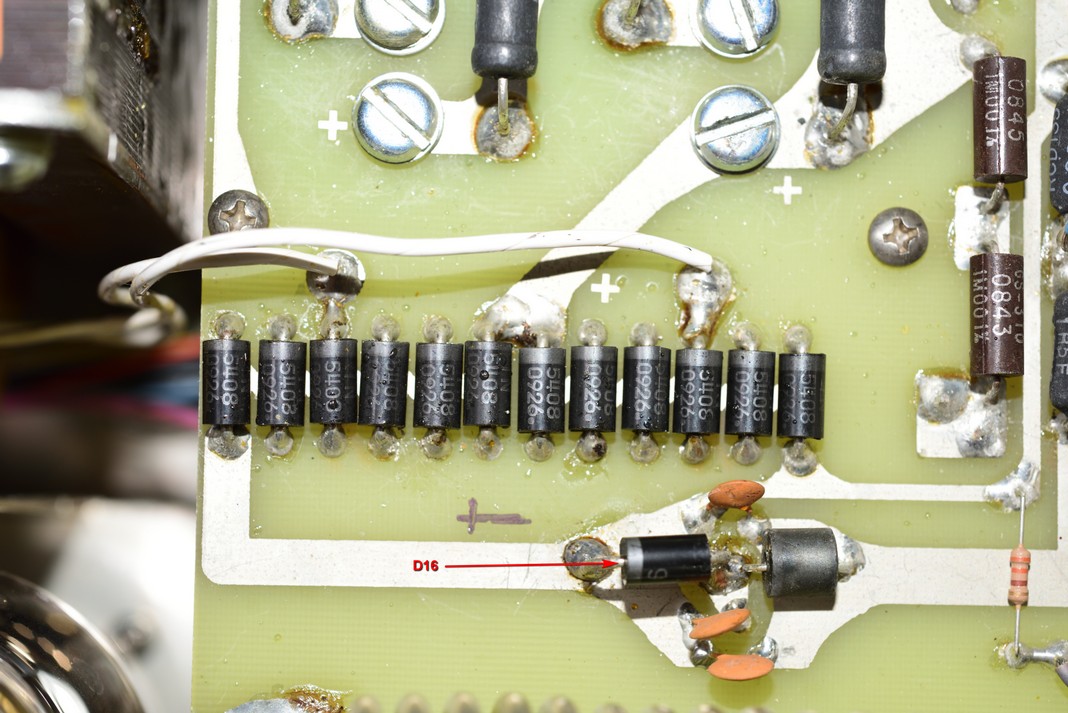 25.) I checked the Diode #D16 and found it to be bad and replaced it while I was in the unit. If the Diode is bad, it will have continuity in both directions of the diode. Left one leg of the diode to check it.
