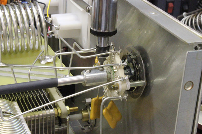 This means as the switch rotates to higher bands, the gap progresses CW  (clockwise) and aligns with 15, 20, 40, and 80, and 160. If the rear band switch is not currently in the position shown below, you will need to realign it before reinstalling the switch coupler. If it is not in alignment, loosen the rear couple set screw and carefully place the rear of the coupler into the rear switch. Attach the front of the coupler to the front band switch and tighten the front set screw. Now loosen the rear set screw and turn the rear coupler shaft until, the rear band switch is in proper alignment and the tighten the rear set screw. Now loosen the front set screw and replace the three screws that hold on the back plate. Once the back plate is on tighten the front set screw on the switch coupler. More information can be found here.