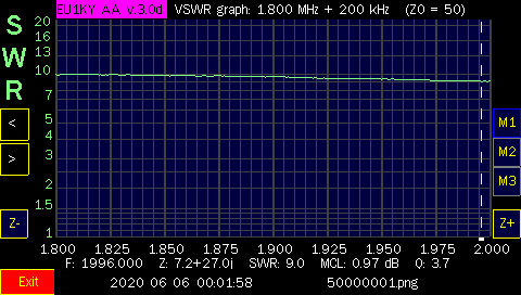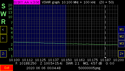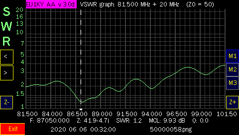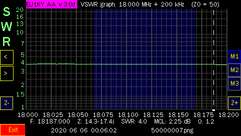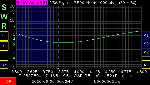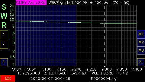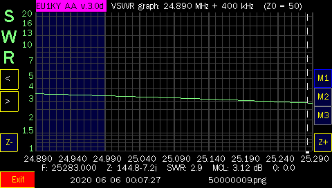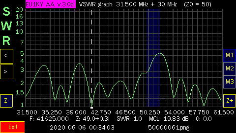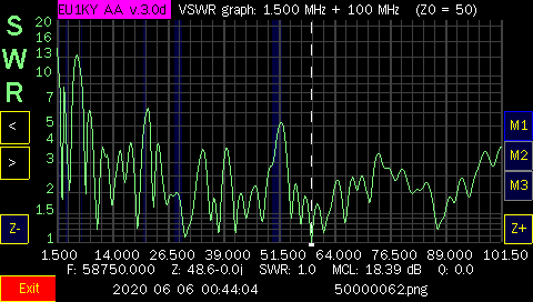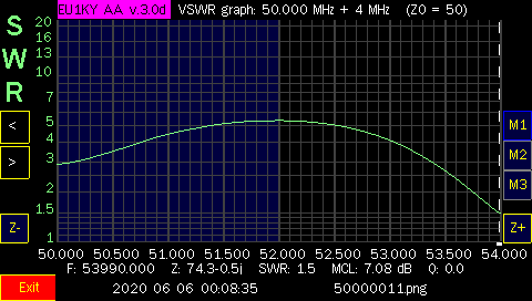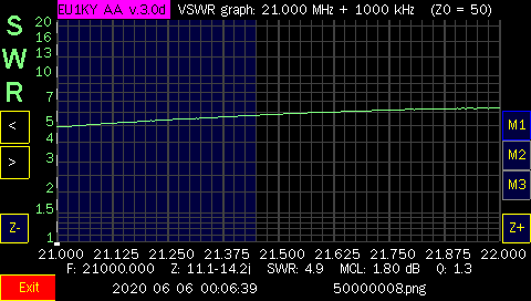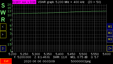The screen shots below, show what I saw on the Mini600 antenna analyzer that has been calibrated at 50 ohms reference (Z0=50). This is the current setup from the antenna analyzer out to antenna which, is swagged: