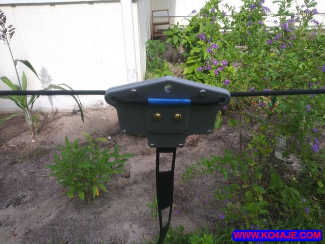 Seventh step - Starting from the center interface, remove any slack in the wire, between the spreaders and straighten the spreaders. When there is no slack wire between each spreader, the instructions indicate there should be 27' - 10" of wire remaining outside, the end of the small spreader. However, when I measured the remaining wire, I found 31' - 3" at each end. I did not trim the wire at this point and wanted to get it in the air and check it with the analyzer before I trimmed it.
