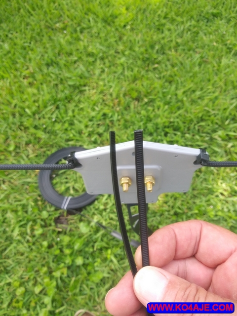 Second step - I attached the feedline assembly to the support rope and centered it to the blue tape maker. I was not sure if, I was supposed to simply zip tie the interface to the support rope or run the support rope through the holes and then zip tie it so, I decided to do the later. I threaded the support rope through the two outer holes of the interface, carefully, making sure I did not move any of the tape markers on the way to the center and then, centered it to the blue tape maker. The instructions say to then, remove the tape but, I left them in place for photos.