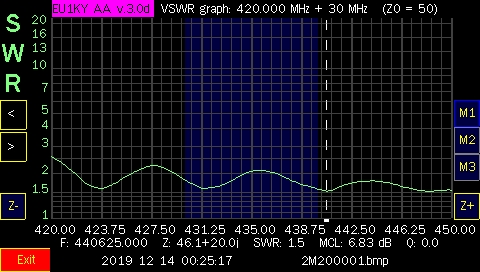 Then on 6/6/2020 I snagged the coax, that I was going to hang up the following day. The coax got caught on the bumper of the Cab Cadet while I was cutting grass and pulled it out of the electrical box that weather sheilds the hole through the wall to the shack into the shack. I guess it got pulled pretty hard because, it broke clean at the electrical box. I lost 15' 8" off of my 100' run of coax. I pulled the 15' section out of the wall and stuck the other end of the coax through the wall and back into the shack. After I put a new Amphinol PL-259 connector on, I put it back on the Mini600 antenna analyzer and did a new graph. Below are the screen shots for 2 meter and 70 cm.